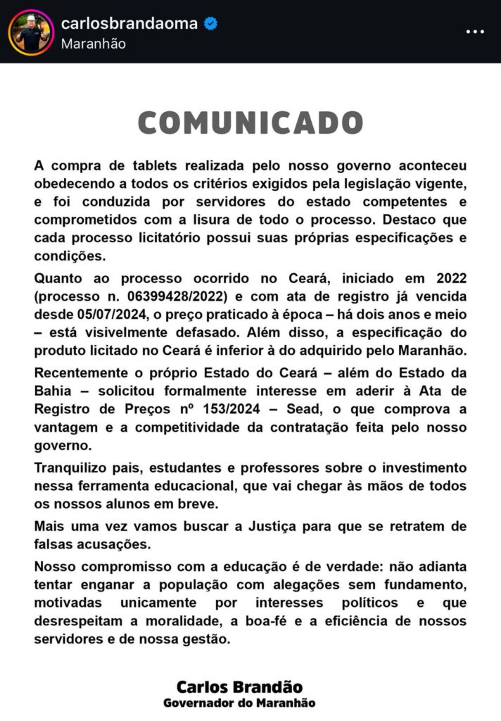 Nesta terça-feira (26), o governador Carlos Brandão publicou comunicado que garante a legalidade do processo de aquisição de tablets feito pelo Estado para serem distribuídos a estudantes da rede pública estadual de ensino. Ele classificou as denúncias de irregularidades como “falsas acusações” motivadas por interesses políticos e afirmou que vai acionar a Justiça para pedir retratação.
