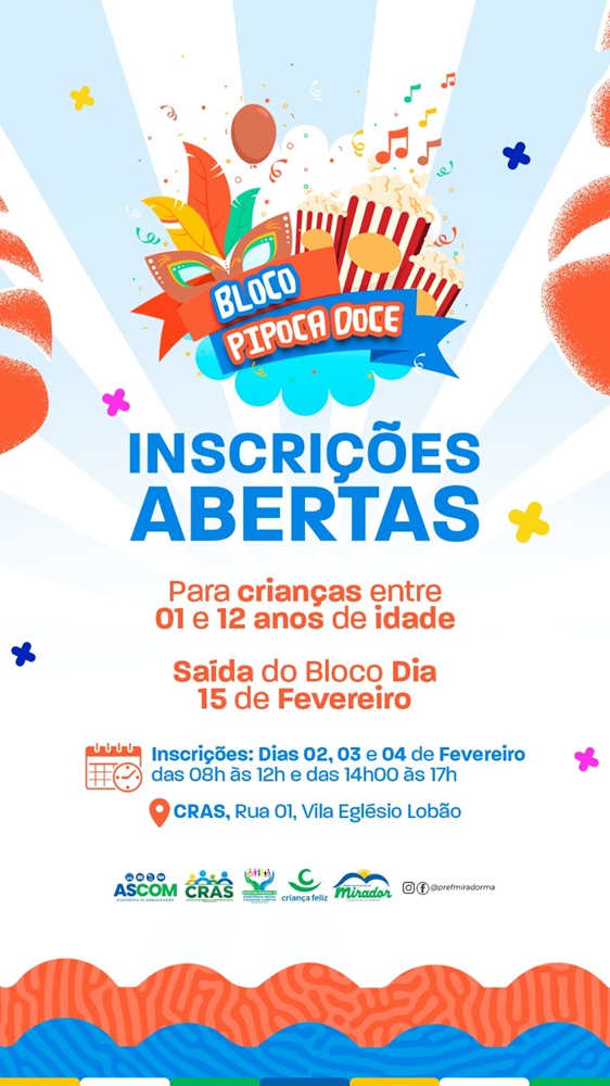 Os grupos de foliões já estão organizados, abadás sendo confeccionados, alguns já disponíveis. O bloco Pipoca Doce está com as inscrições abertas de 2 a 4 de fevereiro no CRAS para crianças de 1 a 12 anos e a saída está marcada para o dia 15.