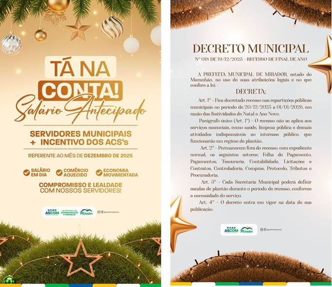 A prefeita de Mirador, Domingas Cabral encerra o ano com o 13ª e o mês de dezembro devidamente pagos. A gestora destacou que a medida, além de valorizar o servidor, injeta dinheiro na economia e fortalece o comércio local neste período de grande movimentação, como está acontecendo no do Festejo do Menino Jesus.